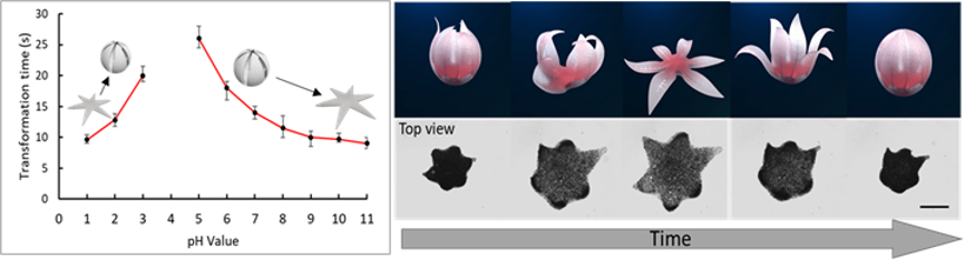 该团队发现褐藻酸水凝胶在非均一电沉积交联固化后具有不同局部密度,受离子浓度、pH值变化的激励可进一步发生交联或分解反应从而积累局部应变,在整体结构上展现为形变与开合。由于离子、pH均为人类等活体中天然存在的环境,该发现激发了团队研发具有生物环境感知自主形变微机器人的灵感。