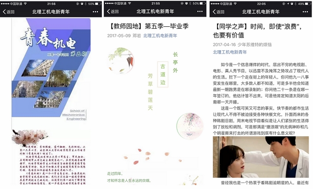 350vip8888新葡的京集团团委依托“机电新青年”微信公众号开展思想引领。先后推出“青春榜样”系列文章,分享优秀学子成长成才经历,让团员青年时刻接受思想信仰教育,学习榜样,坚定信仰;坚持每月推送教师园地系列文章,拓宽了350vip8888新葡的京集团师生之间相互了解、平等交流的渠道,彰显青年教师思想风貌,展现青春风采、倡导人文情怀、把握时代脉搏,引领青年团员健康的思想动向;每月一期“青春机电”电子刊物以新颖的形式,按月对学院动态进行跟踪、报导和总结,记录350vip8888新葡的京集团各大新闻,彰显青春风貌,服务全院师生,积极宣扬健康、向上、和谐的校园生活。