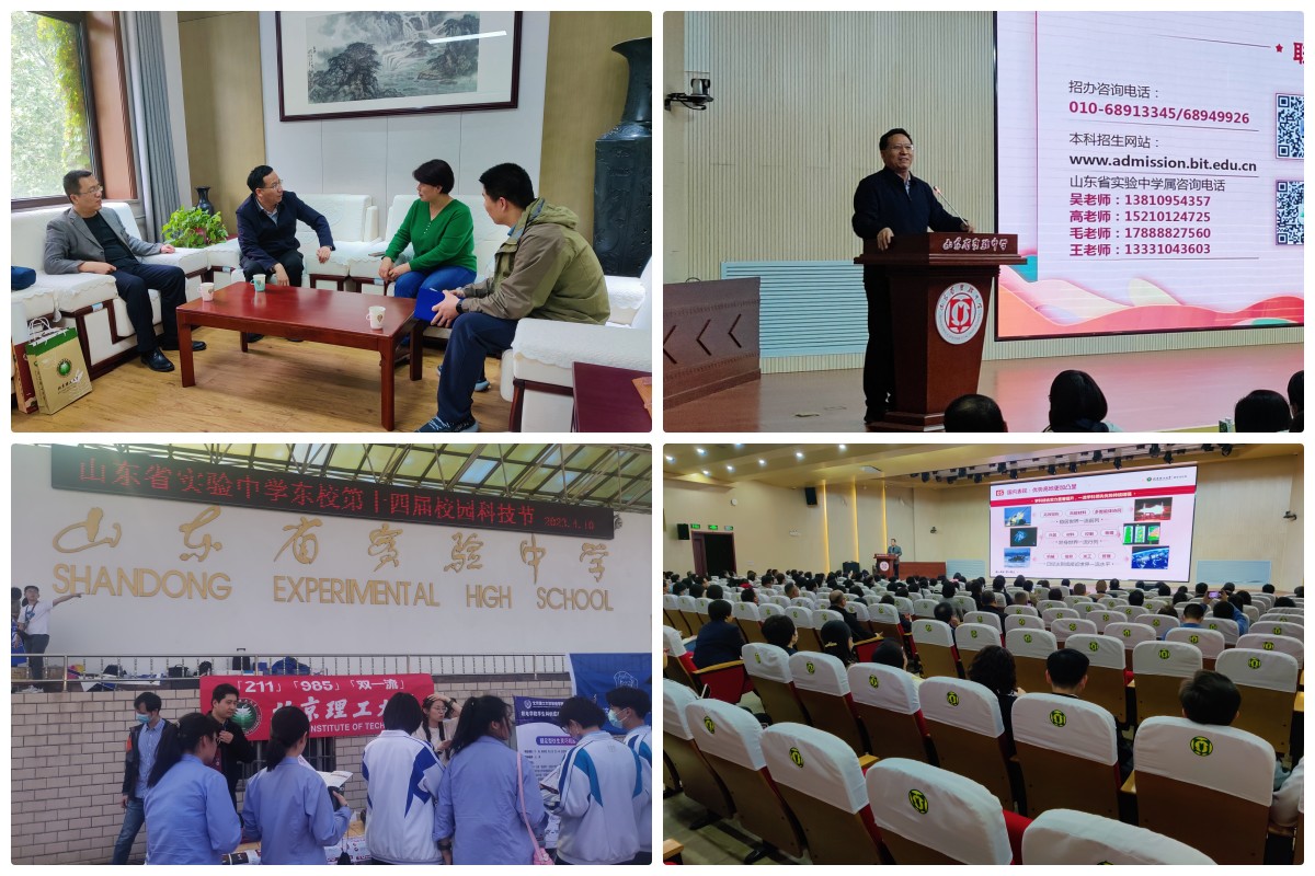 4月13日,王成率招生组一行前往山东省实验中学,北理工智能无人系统队参加中学科技节展示活动,招生组老师为中学赠送喜报,双方进行座谈交流、招生宣讲、科普讲座等活动,受到中学师生的热情欢迎,在高中学生群体中扩大了350vip8888新葡的京集团的知名度,使得更多优秀山东学子认可北理工、选择北理工。